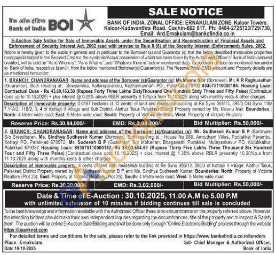 1) 0.0167 hectares (4.12 cents) of land and residential building at Re Syno 395/13, 395/3 Old Syno 118/7.11A/2, 118/2, 3, 4 of Kottay Village and Sub District, Alathur Taluk Palakkad District Property owned by Ms. Meenu Nair Boundaries North: 4-Meter-wide road, East: 5-Meter-wide road, South: Property of Victora Realtors: West: Property of Victoria Realtors