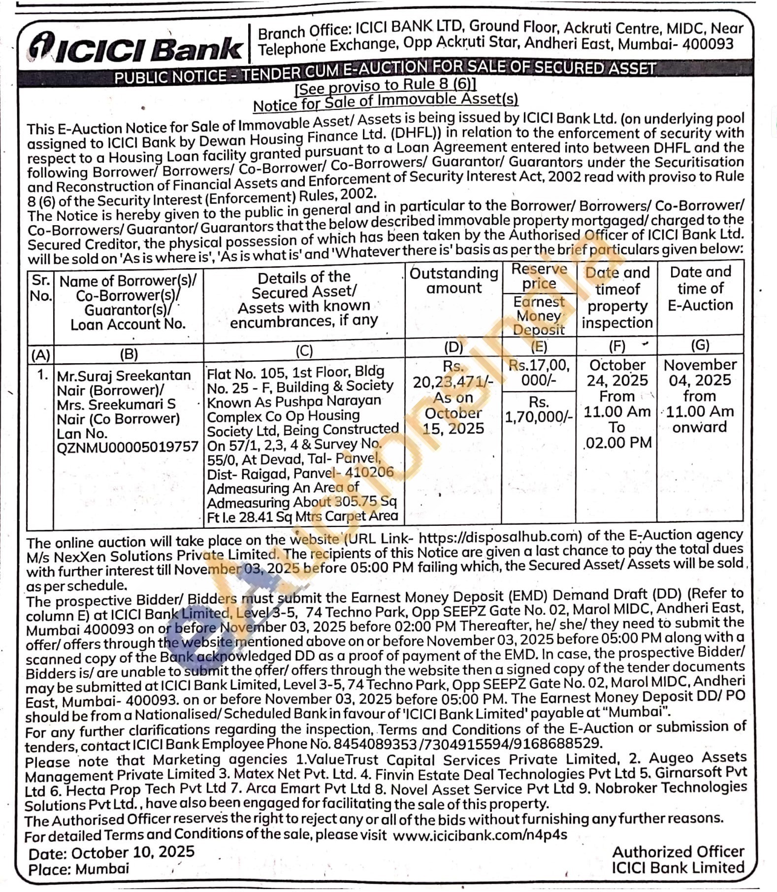 Flat No. 105, 1st Floor, Bldg No. 25-F, Building & Society Known As Pushpa Narayan Complex Co Op Housing Society Ltd, Being Constructed On 57/1, 2,3, 4 & Survey No. 55/0, At Devad, Tal- Panvel, Dist- Raigad, Panvel- 410206 Admeasuring An Area of Admeasuring About 305.75 Sq Ft l.e 28.41 Sq Mtrs Carpet Area