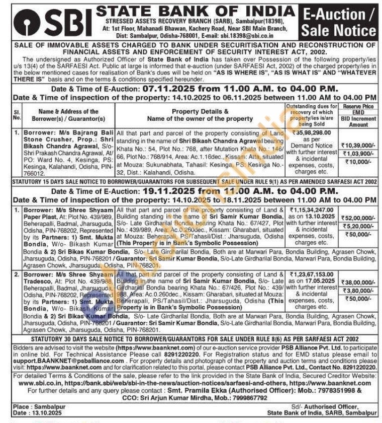 All that part and parcel of the property consisting of Land standing in the name of Shri Bikash Chandra Agrawal bearing Khata No.: 54, Plot No.: 768, after Mutation Khata No.: 146/: 66, Plot No.: 768/914, Area: Ac.1.16dec., Kissam: Atta, situated at Mouza: Sukunabhata, Tahasil: Kesinga, PS: Kesinga No.-32, Dist.: Kalahandi, Odisha.
