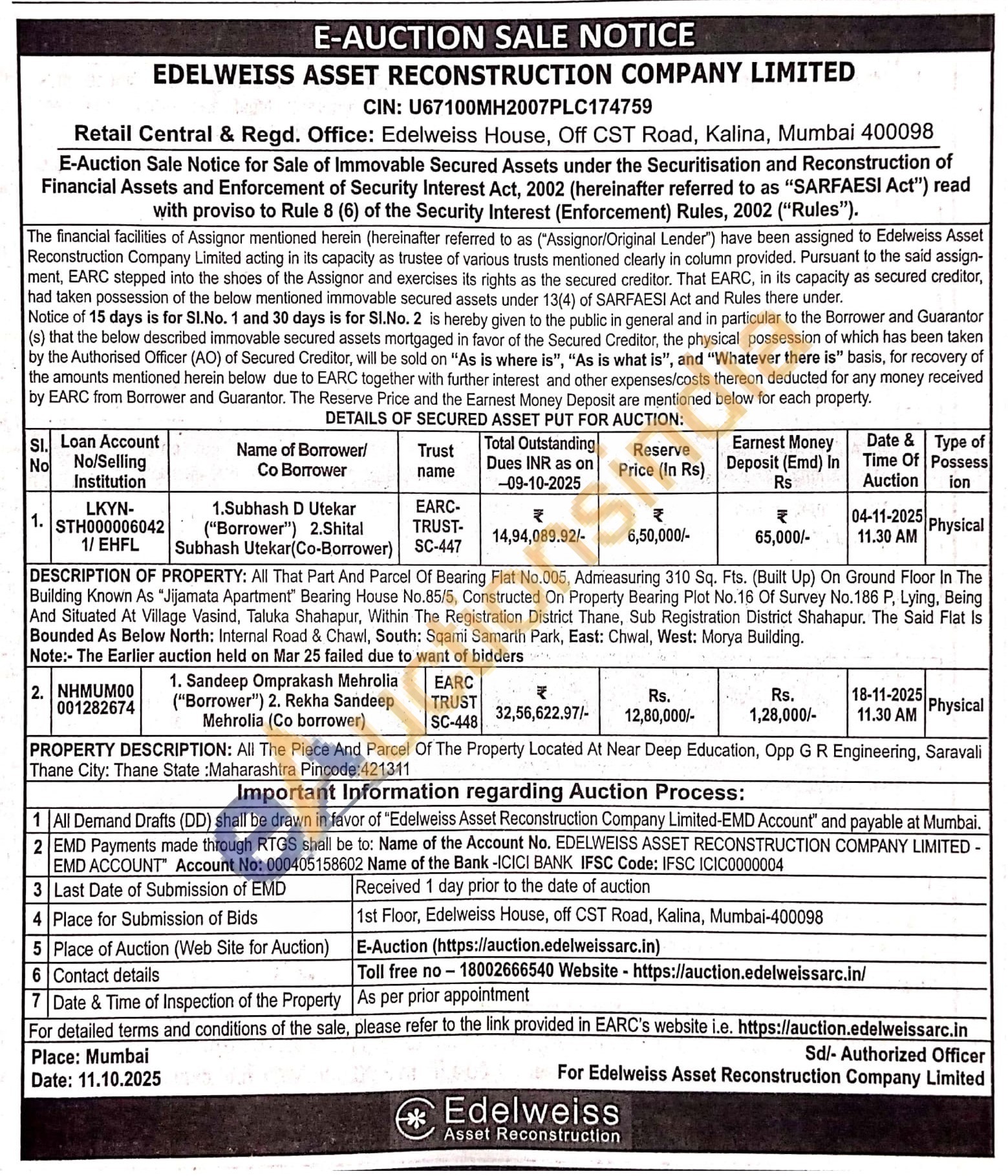 All That Part And Parcel Of Bearing Flat No.005, Admeasuring 310 Sq. Fts. (Built Up) On Ground Floor In The Building Known As "Jijamata Apartment" Bearing House No.85/5, Constructed On Property Bearing Plot No.16 Of Survey No. 186 P, Lying, Being And Situated At Village Vasind, Taluka Shahapur, Within The Registration District Thane, Sub Registration District Shahapur. The Said Flat Is Bounded As Below North: Internal Road & Chawl, South: Sqami Samarth Park, East: Chwal, West: Morya Building. Note:- The Earlier auction held on Mar 25 failed due to want of bidders