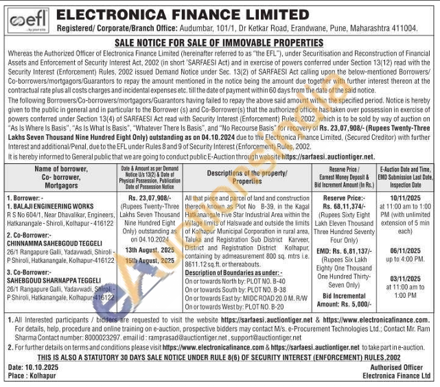 All that piece and parcel of land and construction thereon known as Plot No B-39, in the Kagal Hatkanangale Five Star Industrial Area within the Village limits of Halswade and outside the limits of Kolhapur Municipal Corporation in rural area. Taluka and Registration Sub District Karveer, District and Registration District Kolhapur, containing by admeasurement 800 sq. mtrs ie. 8611.12 sq.ft. or thereabouts. Description of Boundaries as under: - On or towards North by: PLOT NO. 8-40 On or towards South by: PLOT NO.8-38 On or towards East by: MIDC ROAD 20.0 M. R/W On or towards West by: PLOT NO. B-20
