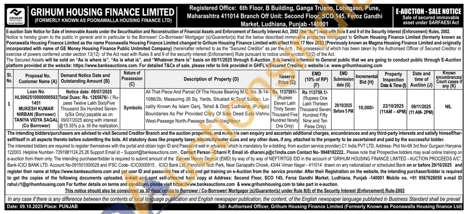 All That Piece And Parcel Of The House Bearing M.C. No. B-14-1086/2b, Measuring 26 Sq. Yards, Situated At Taraf Saidan, Lo-cality Known As Islam Ganj, Tehsil & Distt. Ludhiana. (Punjab) Boundaries As Per Provided Copy Of Sale Deed East-Vishnu West-Passege North-Passege South-Neighbour