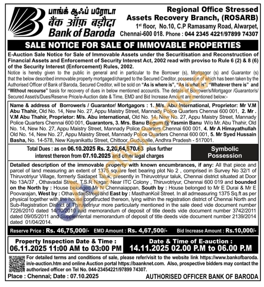 All that piece and parcel of land measuring an extent of 1375 square feet bearing plot No 2, comprised in Survey No 32/1 of Thiruvotriyur Village, formerly Saidapet Taluk, presently in Thiruvotriyur taluk, Chennai district situated at Door No 13A/37, Othavadai Street, T.S.R Nagar, Near ITC Colony, Thiruvotriyur, Chennai 600 019 and bounded on the North by: House belonged Mr N Chennaiappan, South by: House belonged to Mr E Durai & Mr E Poovarajan, West by: Othavadai Street and East by: MasthanKoil Street. In all admeasuring 1375 Sq.ft as per physical together with the house constructed thereon, lying within the registration district of Chennai North and Sub-Registration District of Thiruvotriyur more particularly mentioned in the sale deed vide document number 7226/2010 dated 14/10/2010 and memorandum of deposit of title deeds vide document number 3742/2011 dated 09/05/2011 and Supplemental memorandum of deposit of title deeds vide document number 2139/2014 dated 01/04/2014.
