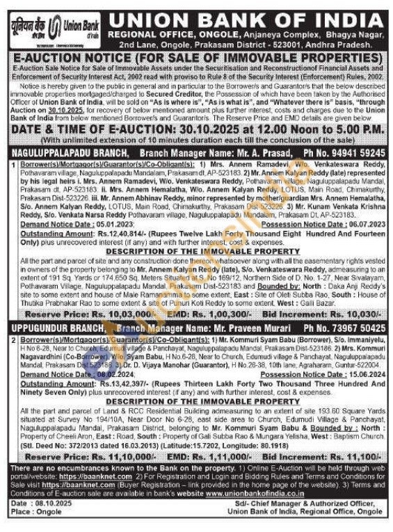 2) All the part and parcel of Land & RCC Residential Building admeasuring to an extent of site 193.60 Square Yards situated at Survey No 194/10A, Near Door No 6-28, east side area to Church, Edumudi Village & Panchayat, Naguluppalapadu Mandal, Prakasam District, belonging to Mr. Kommuri Syam Babu & Bounded by: North: Property of Cheeli Aron, East: Road, South: Property of Gali Subba Rao & Mungara Yelisha, West: Baptism Church. (Stl. Deed No: 372/2013 dated 16.03.2013) (Latitude:15.7202, Longitude: 80.1918