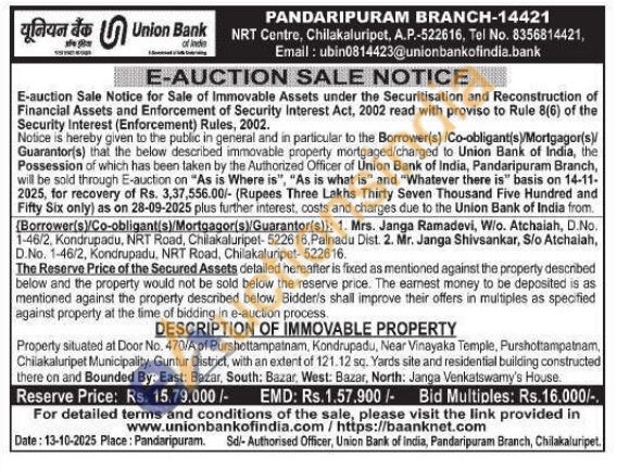 Property situated at Door No. 470/A of Purshottampatnam, Kondrupadu, Near Vinayaka Temple, Purshottampatnam, Chilakaluripet Municipality, Guntur District, with an extent of 121.12 sq. Yards site and residential building constructed there on and Bounded By: East: Bazar, South: Bazar, West: Bazar, North: Janga Venkatswamy's House