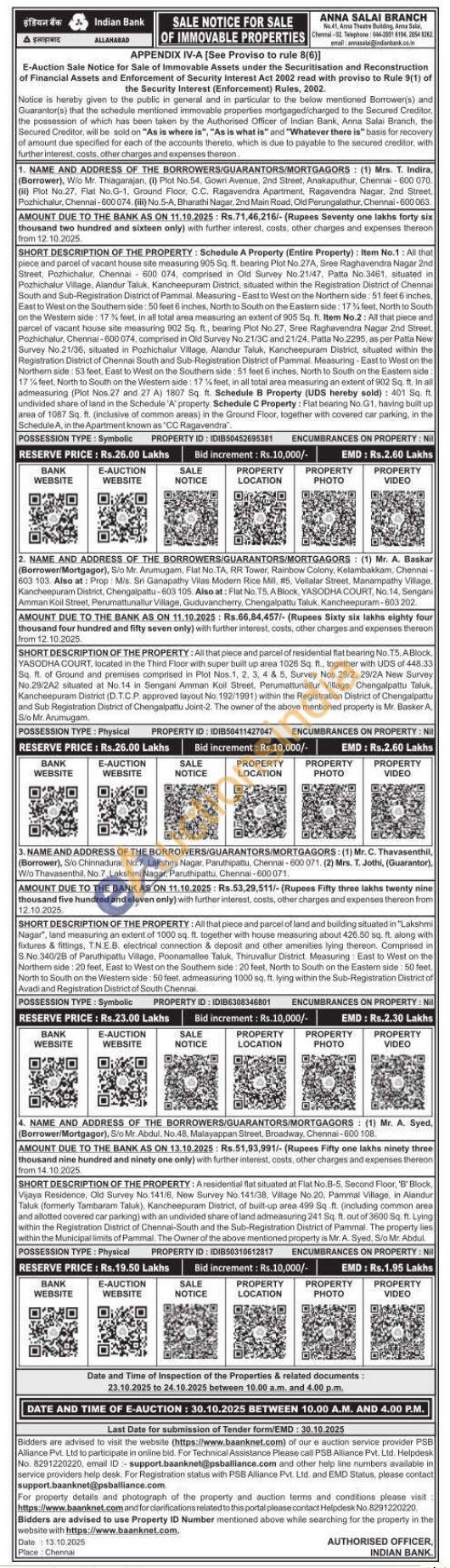 3) All that piece and parcel of land and building situated in "Lakshmi Nagar", land measuring an extent of 1000 sq. ft together with house measuring about 426.50 sq. ft, along with fixtures & fittings, TNE.B. electrical connection & deposit and other amenities lying thereon. Comprised in S.No.340/28 of Paruthipattu Vitage, Poonamallee Taluk. Thiruvallur District, Measuring: East to West on the Northern side: 20 feet, East to West on the Southern side: 20 feet, North to South on the Eastern side: 50 feet North to South on the Westem side: 50 feet, admeasuring 1000 sq. ft. lying within the Sub-Registration District of Avadi and Registration District of South Chennai