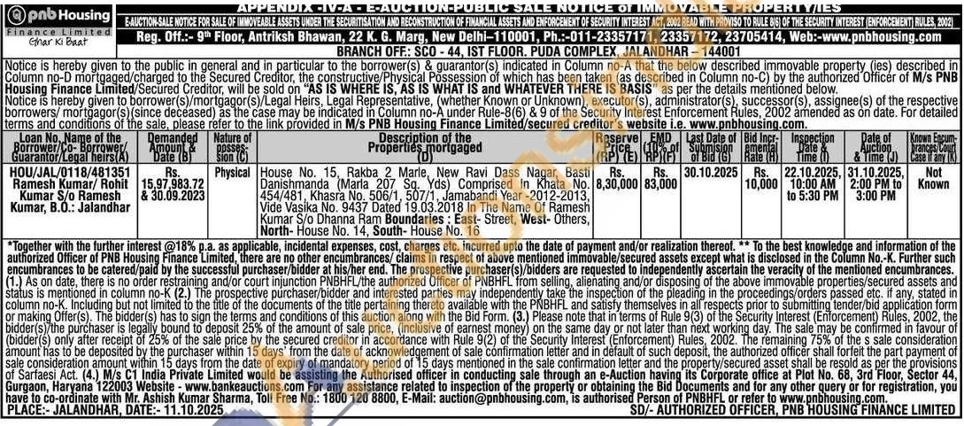 House No. 15. Rakba 2 Marle, New Ravi Dass Nagar, Basti Danishmanda (Marla 207 Sq. Yds) Comprised In Khata No. 454/481, Khasra No. 506/1, 507/1, Jamabandi Year-2012-2013, Vide Vasika No. 9437 Dated 19.03.2018 In The Name Of Ramesh Kumar S/o Dhanna Ram Boundaries: East-Street, West- Others, North-House No. 14, South- House No. 16