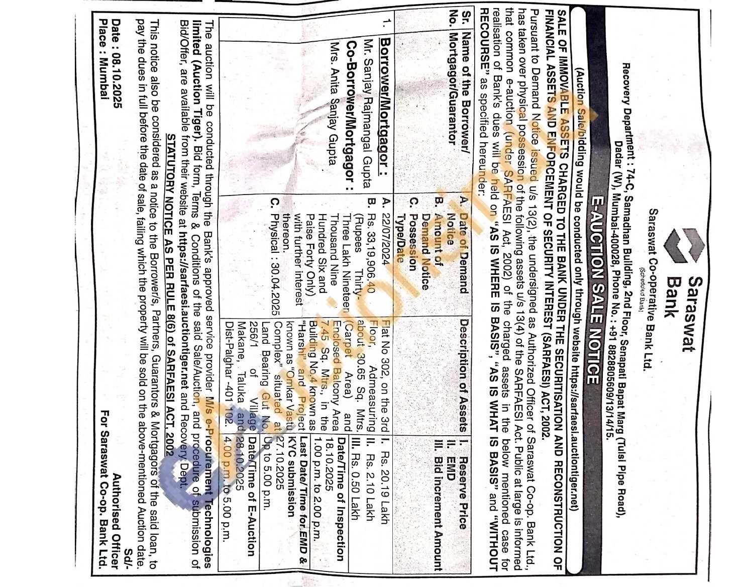 Flat No 302, on the 3rd Floor, Admeasuring about 30.65 Sq. Mtrs. (Carpet Area) and Enclosed Balcony Area 7.45 Sq. Mtrs., in the Building No.4 known as "Harshi" and Project known as "Omkar Vastu Complex" situated at Land Bearing Gut No. 256/1 of Village Makane, Taluka and Dist-Palghar -401 102