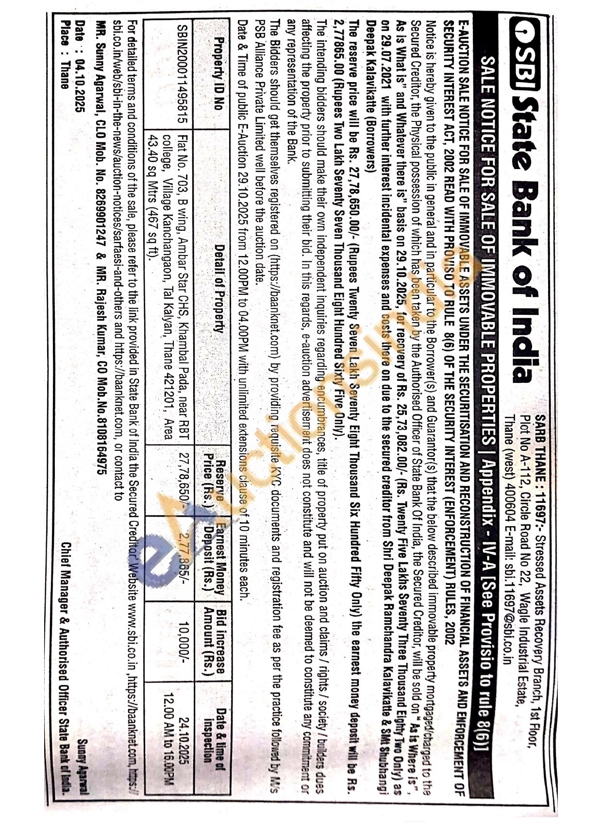 Flat No. 703, B wing, Ambar Star CHS, Khambal Pada, near RBT college, Village Kanchangaon, Tal Kalyan, Thane 421201, Area 43.40 sq Mtrs (467 sq ft).