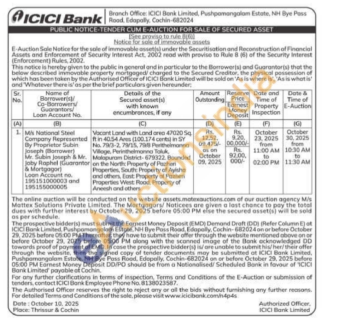 Vacant Land with Land area 47020 Sq. ft in 40.54 Ares (100.174 cents) in SY No. 79/3-2, 79/15, 79/8 Peritheimanna Village, Perinthelmanna Taluk, Malapuram District-679322. Bounded on the North: Property of Pazheri Properties, South: Property of Ayisha and others, East: Property of Pazheri Properties West Road, Property of Aneesh and others