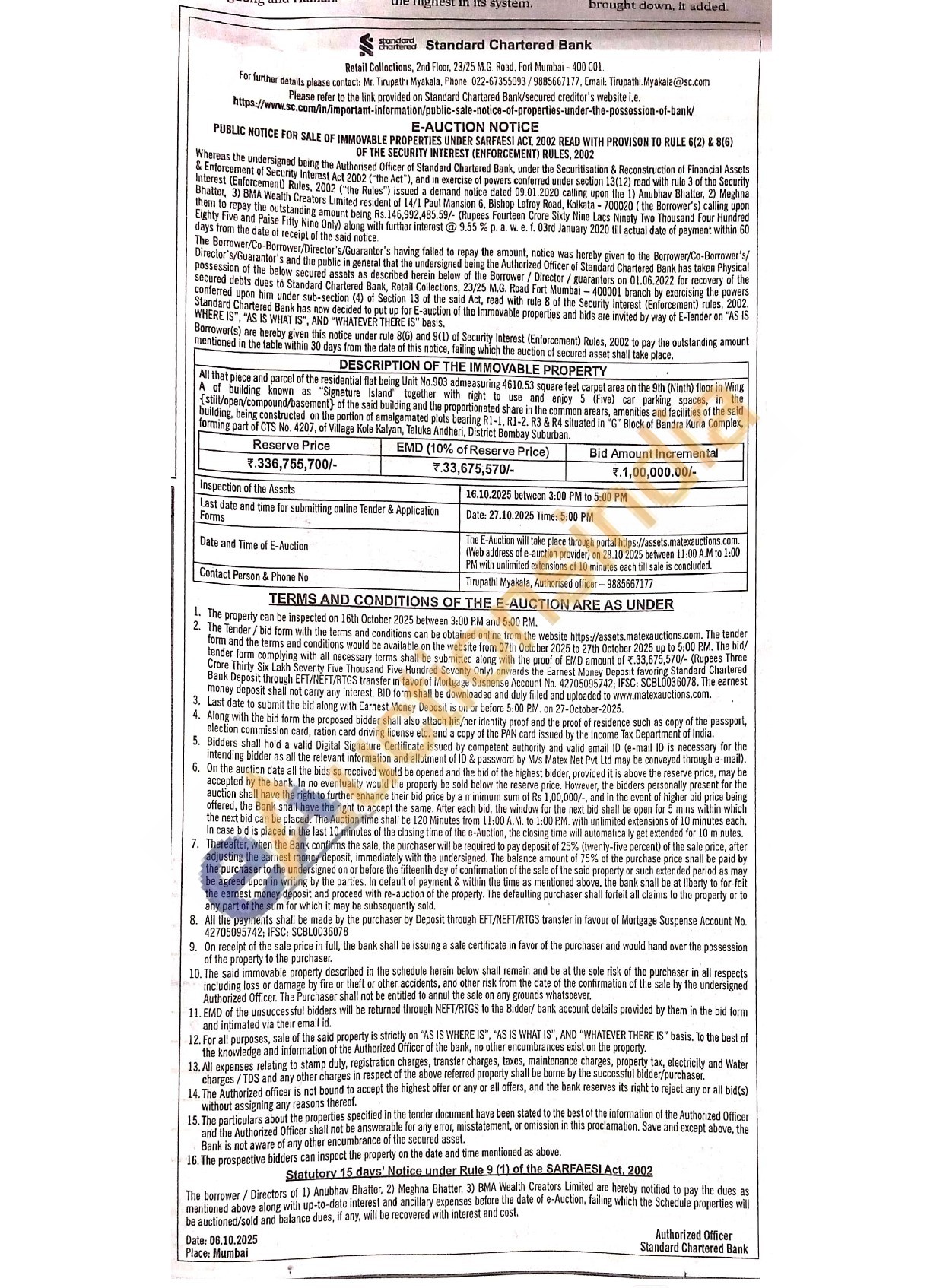 All that piece and parcel of the residential flat being Unit No.903 admeasuring 4610.53 square fett carpet area on the 9th (Ninth) floor in Wing A of building known as "Signature Island together with right to use and enjoy 5 (Five) car parking spaces, in the [stilt/epen/compound/basement) of the said building and the proportionated share in the common arears, amenities and facilities of the said building, beir ding, being constructed on the portion of amalgarnated plots bearing R1-1, R1-2. R3 & R4 situated in "G" Bleck of Bandra Kuria Complex, forming part of CTS No. 4207, of Vilage Kole Kalyan, Taluka Andheri, District Bombay Suburban.