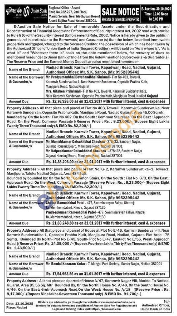 All that piece and parcel of Flat No 403, Tower-II, Karamvir Sundervatika, Near Karamvir Sundervan, Opposite Prabhu Kutir, Manjipura Road, Nadiad Gujarat, Area 45.00 Sqmtr. bounded by: On the North: Flat No 402, On the South: Common Staircase, On the East: Approach Road, On the West: Common Passage