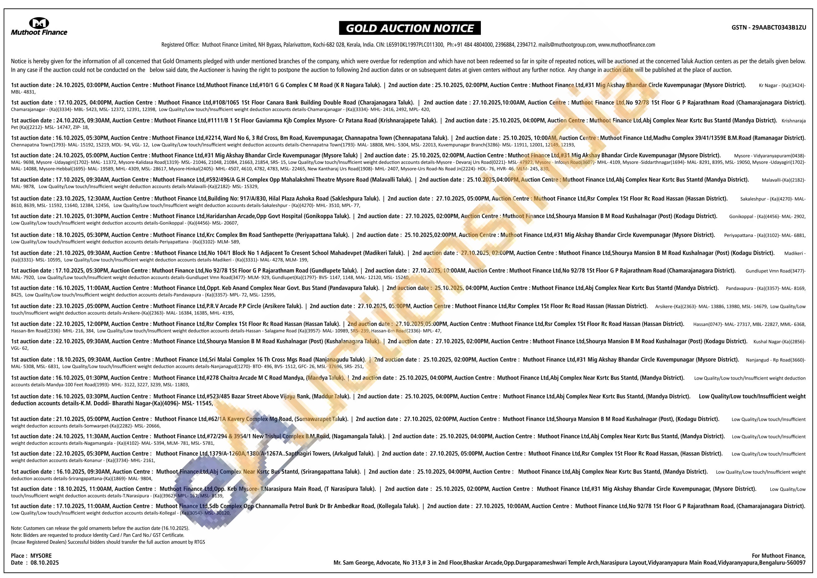 Muthoot Finance Ltd Gold Auctions Auction in Mysuru