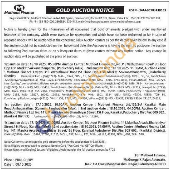 Muthoot Finance Ltd Gold Auctions Auction in Puducherry