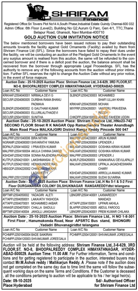 Shriram Finance Ltd Gold Auctions Auction in Hyderabad