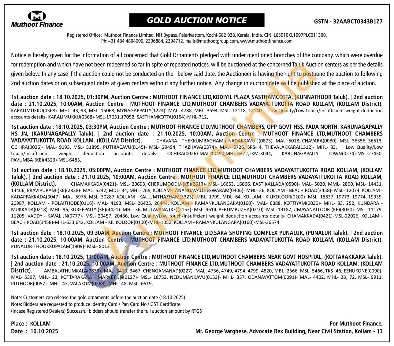 Muthoot Finance Ltd Gold Auctions Auction in Kollam
