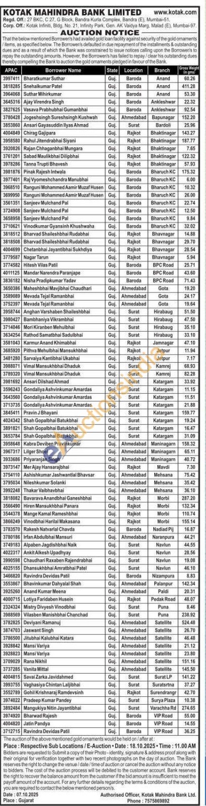 Kotak Mahindra Bank Gold Auctions Auction in Rajkot