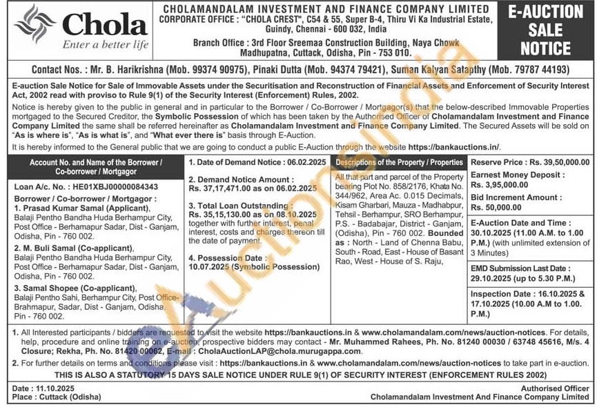 All that part and parcel of the Property bearing Plot No. 858/2176, Khata No. 344/962, Area Ac. 0.015 Decimals, Kisam Gharbari, Mauza - Madhabpur, Tehsil - Berhampur, SRO Berhampur, (Odisha), Pin-760 002. Bounded P.S. Badabajar, District Ganjam, as: North-Land of Chenna Babu, South - Road, East - House of Basant Rao, West - House of S. Raju,