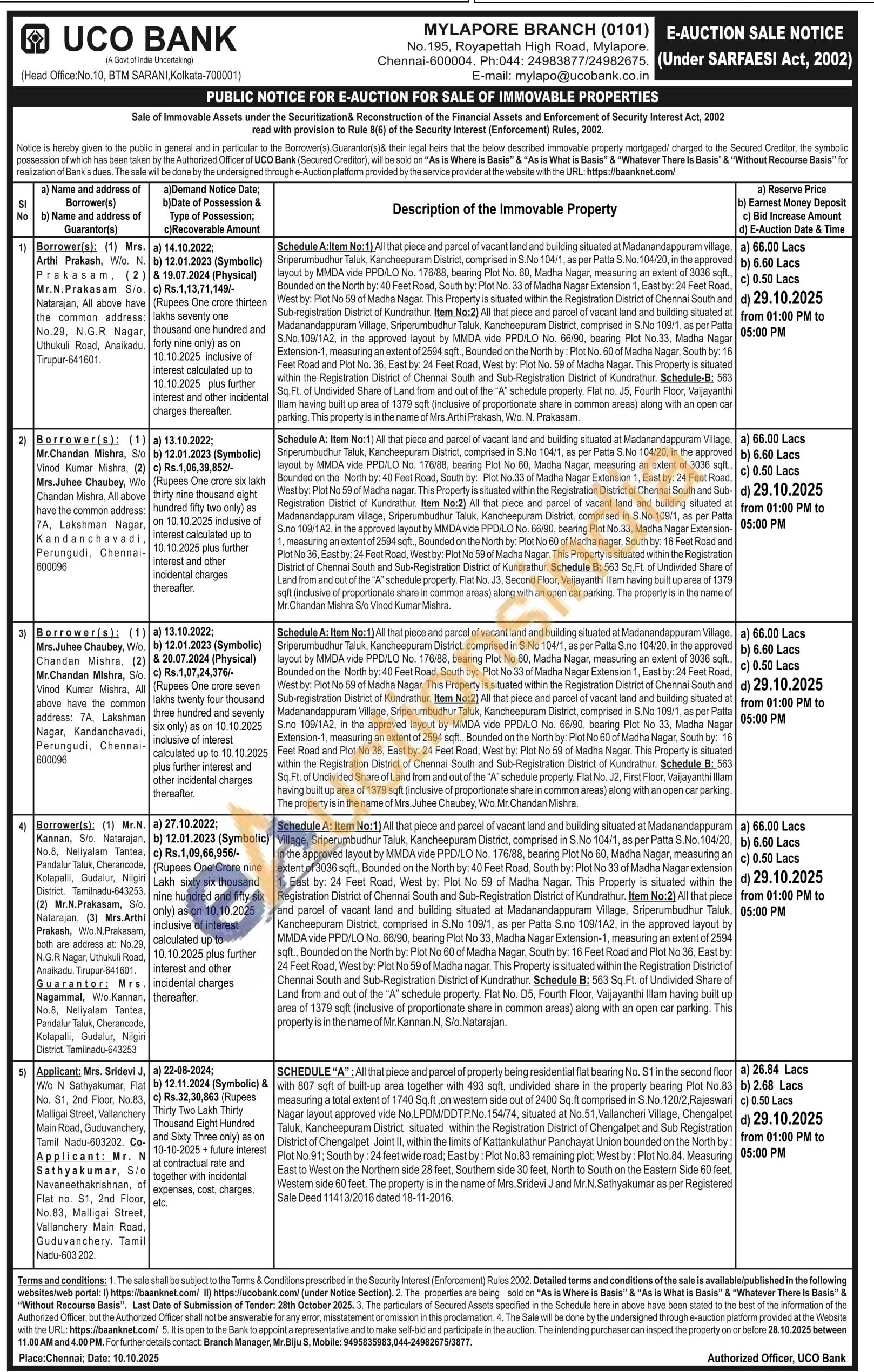 Schedule A: Item No:1) All that piece and parcel of vacant land and building situated at Madanandappuram Village, Sriperumbudhur Taluk, Kancheepuram District, comprised in S.No 104/1, as per Patta S.No. 104/20, in the approved layout by MMDA vide PPD/LO No. 176/88, bearing Plot No 60, Madha Nagar, measuring an extent of 3036 sqft., Bounded on the North by: 40 Feet Road, South by: Plot No 33 of Madha Nagar extension 1, East by: 24 Feet Road, West by: Plot No 59 of Madha Nagar. This Property is situated within the Registration District of Chennai South and Sub-Registration District of Kundrathur. Item No:2) All that piece and parcel of vacant land and building situated at Madanandappuram Village, Sriperumbudhur Taluk, Kancheepuram District, comprised in S.No 109/1, as per Patta S.no 109/1A2, in the approved layout by MMDA vide PPD/LO No. 66/90, bearing Plot No 33, Madha Nagar Extension-1, measuring an extent of 2594 sqft., Bounded on the North by: Plot No 60 of Madha Nagar, South by: 16 Feet Road and Plot No 36, East by: 24 Feet Road, West by: Plot No 59 of Madha nagar. This Property is situated within the Registration District of Chennai South and Sub-Registration District of Kundrathur. Schedule B: 563 Sq.Ft. of Undivided Share of Land from and out of the "A" schedule property. Flat No. D5, Fourth Floor, Vaijayanthi Illam having built up area of 1379 sqft (inclusive of proportionate share in common areas) along with an open car parking. This property is in the name of Mr.Kannan.N, S/o.Natarajan