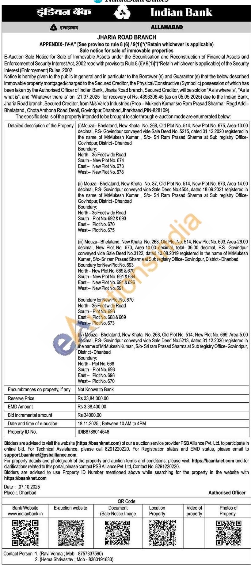 Mouza-Bhelatand, New Khata No. 268, Old Plot No. 514, New Plot No. 675, Area-13.00 decimal, P.S-Govindpur conveyed vide Sale Deed No. 5215, dated 31.12.2020 registered in the name of MrMukesh Kumar, Slo- Sri Ram Prasad Sharma at Sub registry Office-Govindpur, District-Dhanbad Boundary: North-35 Feel wide Road South-New Plot No. 674 East New Plot No. 673 West-New Plot No. 678 (ii) Mouza-Bhelatand, New Khata No. 37, Old Plot No. 514, New Plot No. 673, Area-14.00 decimal, P.S- Govindpur conveyed vide Sale Deed No.4504, dated 18.09.2021 registered in the name of MrMukesh Kumar, Sio- Sri Ram Prasad Sharma at Sub registry Office-Govindpur, District-Dhanbad Boundary: North-35 Feet wide Road East- Plot No. 670 South-Plot No. 692 & 693 West-Plot No. 675 (ii) Mouza-Bhelatand, New Khata No. 268. Old Plat No. 514, New Plot No. 693, Area-26.00 decimal, New Plot No. 670, Area-10.00 decimal, total 36.00 decimal, P.S- Govindpur conveyed vide Sale Deed No.3122, dated 13.08.2019 registered in the name of MrMukesh Kumar, Sio-Sriram Prasad Sharma at Sub registry Office-Govindpur, District-Dhanbad Boundary for New Plot No. 693 North-New Plot No. 669 & 670 South-New Plot No. 691 & 694 East- New Plot No. 694 & 696 West-New Plot No. 691 Boundary for New Plot No. 670 North-35 Feet wide Road South-Plot No. 693 East Plot No. 668 & 669 West-Plot No. 673 (iv) Mouza-Bhelaland, Naw Khata No. 268, Old Plot No. 514, New Plot No. 669, Area-5.00 decimal, P.S- Govindpur conveyed vide Sale Deed No.5213, dated 31.12.2020 registered in the name of MrMukesh Kumar, Sio-Sriram Prasad Sharma at Sub registry Office-Govindpur, District-Dhanbad Boundary: North-Plot No. 668 South-Plot No. 693 East Plot No. 698 West-Plot No. 670