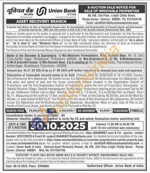 All that piece and parcel of land and the house contructed thereon situated in the Registration District of Puducherry, and the Sub-Registration District of Puducherry, within the limit of Puducherry Municipality, in Olandai Revenue Village, Olandai Keerapalayam, Anitha Nagar, Puducherry bearing as per document Cad.no.46 as per Settlement Extract cad.no.46pt. Ward-K, Block No.3, T.S.No.42, R.S.no.65/4pt, Piot no.23part, Door No.11, Measuring on the north by 17 feet, on the South by 17 feet, on the East by 48.50 feet, and on the West by 48 feet, ie. total extent of 820 Sq.ft. The Porperty is in the name of Mrs.Krishnaveni W/o Balaraman, Mr.Senthil kumar S/o Balaraman and Mr.Muthukumaran S/o Balaraman. Boundaries: West of Land, East of Plot no.24. South of 2nd Cross Street, and North of Portion of Plot sold in Plot No.23.