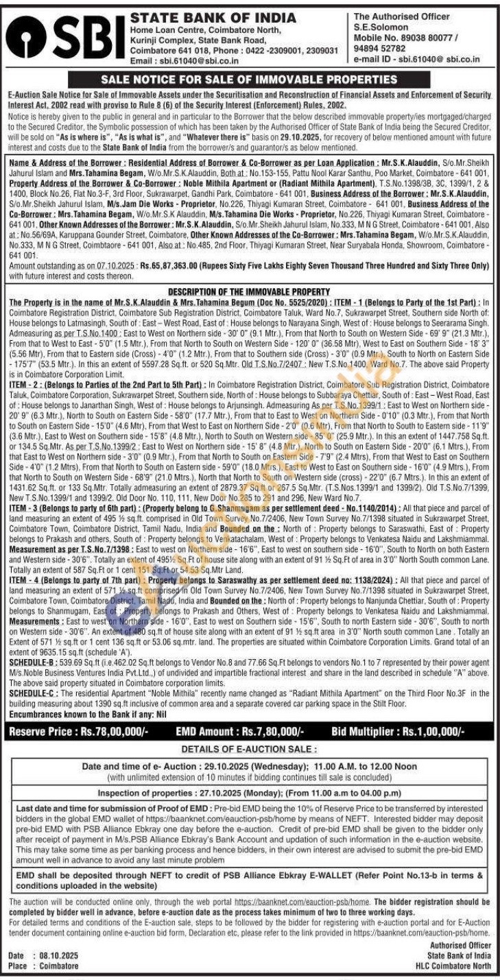 The Property is in the name of Mr.S.K.Alauddin & Mrs. Tahamina Begum (Doc No. 5525/2020): ITEM-1 (Belongs to Party of the 1st Part): In Coimbatore Registration District, Coimbatore Sub Registration District, Coimbatore Taluk. Ward No.7. Sukrawarpet Street, Southern side North of House belongs to Latmasingh, South of East-West Road, East of House belongs to Narayana Singh, West of: House belongs to Seerarama Singh. Admeasuring as per T.S.No.1400 East to West on Northern side-300 (9.1 Mtr), From that North to South on Western Side-699" (21.3 Mtr.). From that to West to East-5'0" (1.5 Mtr.), From that North to South on Western Side 1200 (36.58 Mtr). West to East on Southern Side 183 (5.56 Mtr), From that to Eastern side (Cross)-40 (1.2 Mr.). From that to Southern side (Cross)-30 (0.9 Mtr.). South to North on Eastern Side -1757" (53:5 Mtr.). In this an extent of 5597.28 Sq.ft. or 520 Sq.Mr. Old T.S.No. 7/2407 New T.S.No. 1400, Ward No.7. The above said Property is in Coimbatore Corporation Limit. ITEM-2: (Belongs to Parties of the 2nd Part to 5th Part): In Coimbatore Registration District, Coimbatore Sub Registration District, Coimbatore Taluk, Coimbatore Corporation, Sukrawarpet Street, Southern side, North of House belongs to Subbaraya Chettiar, South of East-West Road, East of House belongs to Janarthan Singh, West of House belongs to Arjunsingh. Admeasuring As per. T.S.No.1399/1, East to West on Northern side-20 9° (6.3. Mtr.). North to South on Eastern Side-58'0" (17.7 Mtr.), From that to East to West on Northern Side-0'10" (0.3 Mtr.), From that North to South on Eastern Side-15'0" (4.6 Mtr), From that West to East on Northern Side-20 (0.6 Mtr), From that North to South to Eastern side-11'9" (3.5 Mtr.), East to West on Southern side-15'8" (4.8 Mtr.), North to South on Western side-85° 0° (25.9 Mtr.). In this an extent of 1447.758 Sq.ft. or 134.5 50. Mtr. As per T.S.No. 1399/2, East to West on Northern side 15' 8" (4.8 Mtr.), North to South on Eastern Side 20'0" (6.1 Mtrs.), From that East to West on Northern side-3'0" (0.9 Mtr.), From that North to South on Eastern Side-79 (2.4 Mtrs), From that West to East on Southern Side 40 (1.2 Mtrs). From that North to South on Eastem side-590" (18.0 Mtrs.), East to West to East on Southern side-160 (4.9 Mirs.). From That North to South on Western Side 68'9" (21.0 Mtrs.), North that North to South on Western side (cross) 22'0" (6.7 Mtrs.). In this an extent of 1431.62 Sq.ft. or 133 Sq Mtr. Totally admeasuring an extent of 2879.37 Sq.ft or 267.5 Sq Mtr. (T.S.Nos. 1399/1 and 1399/2). Old T.S.No. 7/1399. New TS No.1399/1 and 1399/2. Old Door No. 110, 111, New Door No.285 to 291 and 296. New Ward No.7. ITEM-3 (Belongs to party of 6th part): (Property belong to G. Shanmugam as per settlement deed No.1140/2014): All trat piece and parcel of land measuring an extent of 495 % saft. comprised in Old Town Survey No.7/2406, New Town Survey No. 7/1398 situated in Sukrawarpet Street, Coimbatore Town, Coimbatore District, Tamil Nadu, India and Bounded on the North of Property belongs to Saraswathi, East of Property belongs to Prakash and others. South of Property belongs to Venkatachatam, West of: Property belongs to Venkatesa Naidu and Lakshmiammal Measurement as per T.S.No. 7/1398: East to west on Northern side-16'6", East to west on southern side-16'0", South to North on both Eastern and Western side-30-6". Totally an extent of 4951% Sq. Ft of house site along with an extent of 91% Sq.ft of area in 3'0" North South common Lane. Totally an exterit of 587 Sq.Ft or 1 cent 151 Sq.Ft or 54.53 Sq.Mtr Land. ITEM-4 (Belongs to party of 7th part): Property belongs to Saraswathy as per settlement deed na: 1138/2024): All that piece and parcel of land measuring an extent of 571 16 sq.ft comprised in Old Town Survey No.7/2406, New Town Survity No. 7/1396 situated in Sukrawarpet Street, Coimbatore Town, Coimbatore District, Tamil Nadu, India and Bounded on the North of: Property belongs to Nanjunda Chettiar, South of: Property belongs to Shanmugam, East of: Property belongs to Prakash and Others, West of Property belongs to Venkatesa Naidu and Lakshmiammal. Measurements: East to west on Northern side-160", East to west on Southern side-15'6", South to north Eastern side-306", South to north on Western side 30'6" An extent of 480 sq.ft of house site along with an extent of 91 15 sq.ft area in 3'0" North south common Lane. Totally an Extent of 571 15 sq.ft or 1 cent 136 sq.ft or 53.06 sq.mtr. land. The properties are situated within Coimbatore Corporation Limits. Grand total of an extent of 9635.15 sq.ft (schedule 'A'). SCHEDULE-B: 539.60 Sq.ft (ie 462.02 Sq.ft belongs to Vendor No.8 and 77.66 Sq Ft belongs to vendors No. 1 to 7 represented by their power agent Mis. Noble Business Ventures India Pvt.Ltd..) of undivided and impartible fractional interest and share in the land described in schedule "A" above. The above said property situated in Coimbatore corporation limits. SCHEDULE-C: The residential Apartment "Noble Mithila recently name changed as "Radiant Mithila Apartment on the Third Floor No.3F in the building measuring about 1390 sq.ft inclusive of common area and a separate covered car parking space in the Stilt Floor. Encumbrances known to the Bank if any: Nil