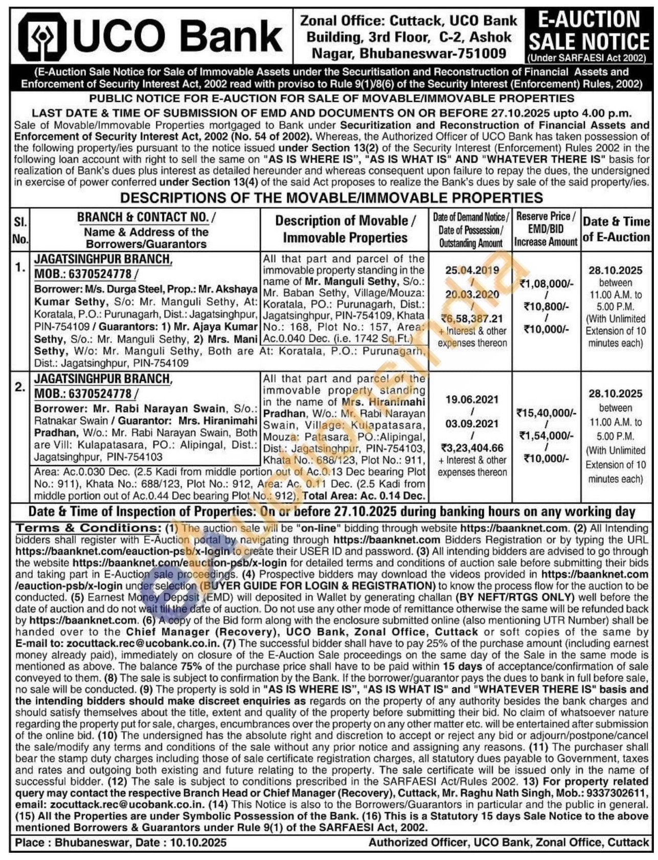 All that part and parcel of the immovable property standing in the name of Mrs. Hiranimahi Pradhan, W/o.: Mr. Rabi Narayan Swain, Village: Kulapatasara, Mouza: Patasara, PO.:Alipingal, Dist.: Jagatsinghpur, PIN-754103, Khata No.: 688/123, Plot No.: 911 Area: Ac.0.030 Dec. (2.5 Kadi from middle portion out of Ac.0.13 Dec bearing Plot No.: 911), Khata No.: 688/123, Plot No.: 912, Area: Ac. 0.11 Dec. (2.5 Kadi from middle portion out of Ac.0.44 Dec bearing Plot No.: 912), Total Area: Ac. 0.14 Dec