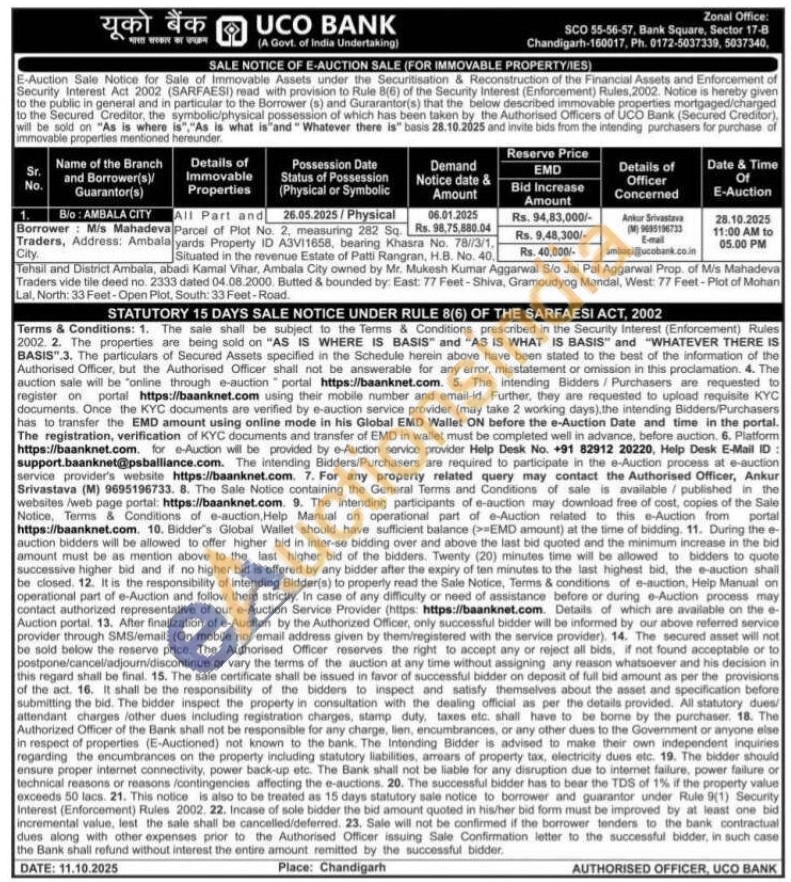 All Part and Parcel of Plot No. 2, measuring 282 Sq. yards Property ID A3V11658, bearing Khasra No. 78//3/1. Situated in the revenue Estate of Patti Rangran, H.B. No. 40 Tehsil and District Ambala, abadi Kamal Vihar, Ambala City owned by Mr. Mukesh Kumar Aggarwal Sio Jai Pal Aggarwal Prop. of Mis Mahadeva Traders vide tile deed no. 2333 dated 04.08.2000. Butted & bounded by: East: 77 Feet-Shiva, Gramoudyog Mandal, West: 77 Feet-Plot of Mohan Lal, North: 33 Feet-Open Plot, South: 33 Feet-Road
