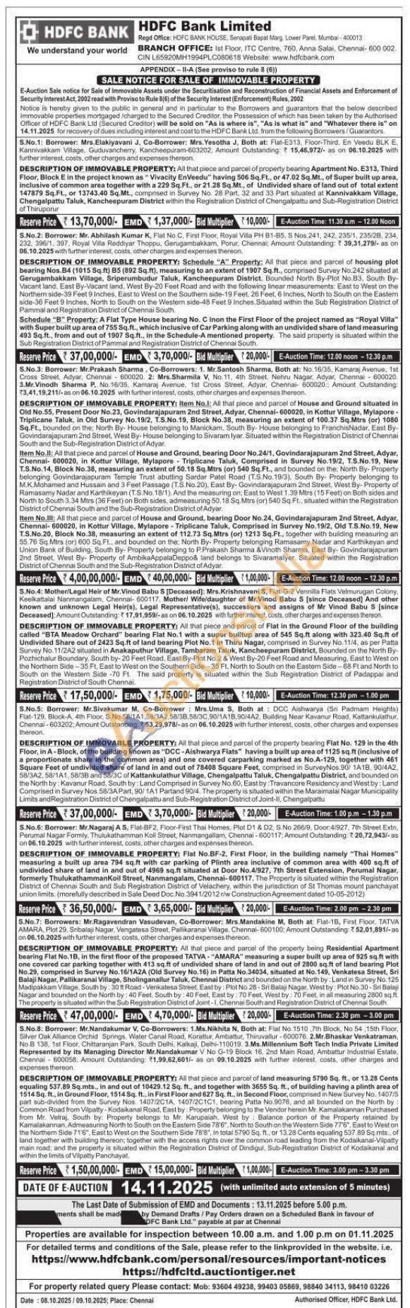 All that piece and parcel of Flat in the Ground Floor of the building called "BTA Meadow Orchard" bearing Flat No.1 with a super builtup area of 545 Sq.ft along with 323.40 Sq.ft of Undivided Share out of 2423 Sq.ft of land bearing Plot No.1 in Thiru Nagar, comprised in Survey No. 11/4, as per Patta Survey No. 11/2A2 situated in Anakaputhur Village, Tambaram Taluk, Kancheepuram District, Bounded on the North By-Pozhichalur Boundary, South by-20 Feet Road, East By-Plot No.2 & West By-20 Feet Road and Measuring, East to West on the Northern Side-35 Ft. East to West on the Southern Side-35 Ft, North to South on the Eastern Side-68 Ft and North to South on the Western Side -70 FL. The said property is situated within the Sub Registration District of Padappal and Registration District of South Chennai