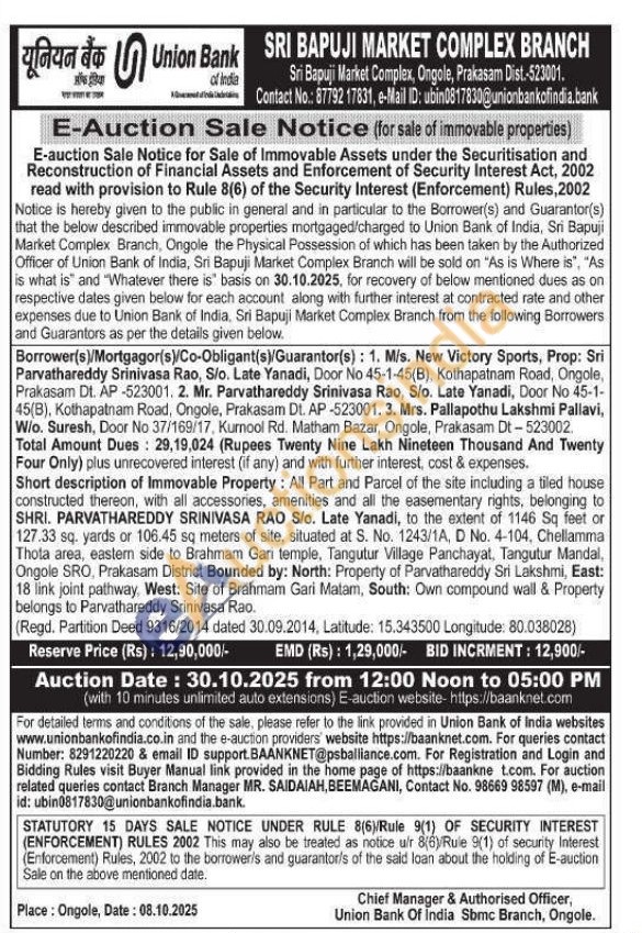 All Part and Parcel of the site including a tiled house constructed thereon, with all accessories, amenities and all the easementary rights, belonging to SHRI. PARVATHAREDDY SRINIVASA RAO S/o. Late Yanadi, to the extent of 1146 Sq feet or 127.33 sq. yards or 106.45 sq meters of site, situated at S. No. 1243/1A, D No. 4-104, Chellamma Thota area, eastern side to Brahmam Gari temple, Tangutur Village Panchayat, Tangutur Mandal, Ongole SRO, Prakasam District Bounded by: North: Property of Parvathareddy Sri Lakshmi, East: 18 link joint pathway, West: Site of Brahmam Gari Matam, South: Own compound wall & Property belongs to Parvathareddy Srinivasa Rao.