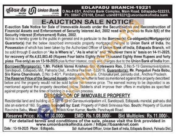 Residential land and building at D.No. 5-19 of Ganesunivaripalem vill, Sandepudi, Edlapadu mandal, palnadu dist site an extent of 160. Sq yards bounded by: East: Property of Pidikiti Srinivasa Rao, South: Property of Gurram Ravindra Babu, West: Property of Pidikiti Kiran Kumar, North: Panchayati Road