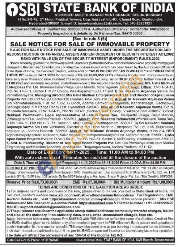 Vacant Land of Ac 3.45 cents admeasuring a total extent of 16698 Sq. Yds situated at Nidigattu Village, Bheemunipatnam Mandal, Anandapuram SRO, Visakhapatnam Dist. consists of Ac.0. 56 cents in Sy No. 13/2, Ac. 1.81 cents in SY No 13/2P & Ac. 1.08 cents in Sy No.20/3P belonging to Mis. Apex Encon Projects Pvt. Ltd. (Title Deed No 639/2009