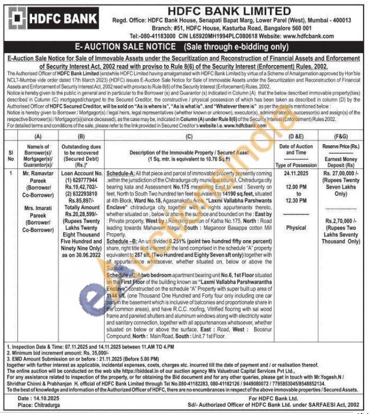 All that piece and parcel of immovable property presently coming within the jurisdiction of the Chitradurga city municipal council, Chitradurga city bearing kata and Assessment No.175 measuring East to west: Seventy on feet, North to South Two hundred ten feet equivalent to 14190 sq.feet, situated at 4th Block, Ward No.18, Agasanakallu Area, "Laxmi Vallabha Parshwants Enclave" chitradurga city together with all rights appurtenants thereto, whether situated on, below or above the surface and bounded on the: East by Private property, West by: Remaing portion of Katha No.175, North: Road leading towards Mahaveer Nagar, South: Maganoor Basappa cotton Mill Property. Schedule -B: An un divided 0.251% (point two hundred fifty one percent) share, right title and interest in the land comprised in the schedule "A" property equivalent to 287 sft. (Two Hundred and Eighty Seven sft only) together with all appurtenance whatsoever, whether situated on, below or above the Surface. Schedule-C: Atwo bedroom apartment bearing unit No.6, 1st Floor situated on the First Floor of the building known as "Laxmi Vallabha Parshwarantha Enclave" constructed on the schedule "A" Property with super built up area of 1144 sft. (one Thousand One Hundred and Forty four only including one car park in the basement which is inclusive of balconies and proportionate share in the common areas), and have R.C.C. roofing, Vitrified flooring with sal wood frame and paneled shutters and aluminum windows along with electricity water and sanitary connection, together with all appurtenances whatsoever, whether situated on below or above the surface. East Road, West: Boosnur Compound, North: Main Road, South: Unit 7 1st Floor