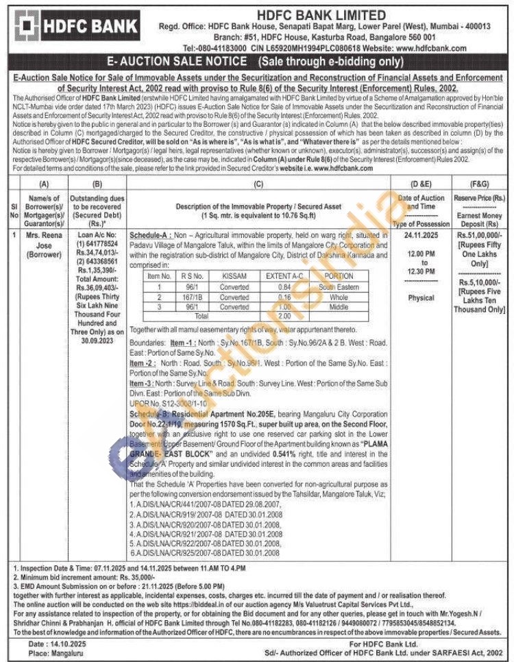 Non-Agricultural immovable property, held on warg right, situated in Padavu Village of Mangalore Taluk, within the limits of Mangalore City Corporation and within the registration sub-district of Mangalore City, District of Dakshina Kannada and comprised in: Boundaries: Item-1: North Sy. No.167/1B, South: Sy. No.96/24 & 28. West: Road. East: Portion of Same Sy.No. Item-2: North Road. South: Sy.No.96/1. West Portion of the Same Sy.No. East: Portion of the Same Sy.No. Item-3: North: Survey Line & Road. South: Survey Line. West: Portion of the Same Sub Divn. East: Portion of the Same Sub Divn. UPOR No. $12-3008/1-10 Schedule-B: Residential Apartment No.205E, bearing Mangaluru City Corporation Door No.22-1/10, measuring 1570 Sq.Ft., super built up area, on the Second Floor, together with an exclusive right to use one reserved car parking slot in the Lower Basement Upper Basement/ Ground Floor of the Apartment building known as "PLAMA GRANDE-EAST BLOCK" and an undivided 0.541% right, title and interest in the Schedule 'A' Property and similar undivided interest in the common areas and facilities and amenities of the building. That the Schedule 'A' Properties have been converted for non-agricultural purpose as per the following conversion endorsement issued by the Tahsildar, Mangalore Taluk, Viz, 1. A.DIS/LNA/CR/441/2007-08 DATED 29.08.2007, 2.A.DIS/LNA/CR/919/2007-08 DATED 30.01.2008 3. A.DIS/LNA/CR/920/2007-08 DATED 30.01.2008. 4.A.DIS/LNA/CR/921/2007-08 DATED 30.01.2008 5. A.DIS/LNA/CR/922/2007-08 DATED 30.01.2008, 6.A.DIS/LNA/CR/925/2007-08 DATED 30.01.2008
