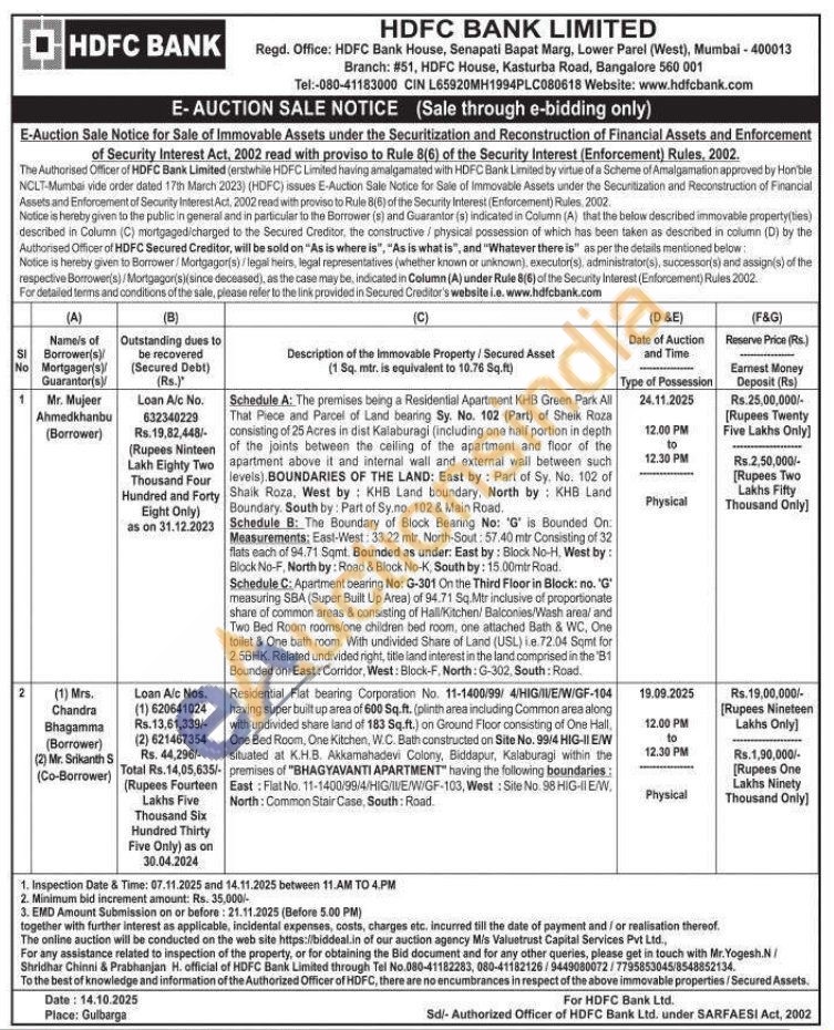 1) The premises being a Residential Apartment KHB Green Park All That Piece and Parcel of Land bearing Sy. No. 102 (Part) of Sheik Roza consisting of 25 Acres in dist Kalaburagi (including one half portion in depth of the joints between the celling of the apartment and floor of the apartment above it and internal wall and external wall between such levels) BOUNDARIES OF THE LAND: East by: Part of Sy. No. 102 of Shaik Roza, West by: KHB Land boundary, North by: KHB Land Boundary. South by: Part of Sy.no. 102 & Main Road. Schedule B: The Boundary of Block Bearing No: 'G' is Bounded On: Measurements; East-West: 33.22 mtr, North-Sout: 57.40 mtr Consisting of 32 flats each of 94.71 Sqmt. Bounded as under: East by: Block No-H, West by: Block No-F, North by: Road & Block No-K, South by: 15.00mtr Road. Schedule C: Apartment bearing No: G-301 On the Third Floor in Block: no. "G" measuring SBA (Super Built Up Area) of 94.71 Sq.Mtr inclusive of proportionate share of common areas & consisting of Hall/Kitchen/ Balconies/Wash areal and Two Bed Room rooms/one children bed room, one attached Bath & WC, One toilet & One bath room. With undivided Share of Land (USL) ie. 72.04 Somt for 2.5BHK. Related undivided right, title land interest in the land comprised in the '81 Bounded on: East: Corridor, West: Block-F. North: G-302, South: Road