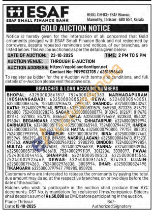 ESAF SMALL FINANCE BANK Gold Auctions Auction in Thrissur