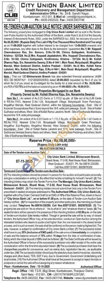 Item No.1: An extent of Ac.0.23 Cents or 1,113.2 sq yds of Site out of Ac.2.49 Cents in RS No.110/3, Nearest D.No.1-24, Mutyalapali Village, Mutyalapalli Gram Panchayat, Mogalthur Mandal, West Godavan District, within the following boundaries East: Site of Kopanali Suryaprakasa Rao's Sons beyond the 18 ft. wide joint passage, South: Site of Kollati Sudhakar and others, West: Site of Kollati Rama Lakshmi, North: Site of Sadhanala Manibabu beyond the 10 ft. wide joint passage Item No.2: An extent of Ac.0.23 Cents or 1,113.2 Sq yds of Site out of Ac. 1.42 Cents in RS.No. 110/2, Nearest D.No.1-24, Mutyalapali Village, Mutyalapali Gram Panchayat, Mogalthur Sub-Registry, Mogathur Mandal, West Godavari District, within the following boundaries East: Site of Kollai Rama Lakshmi and 10 ft. wide passage, South: Site of Sadhansia Venkata Swamy Naidu and others, West: Site of Addala Peddiraju and others, North Site of Sadhanala Maribabu