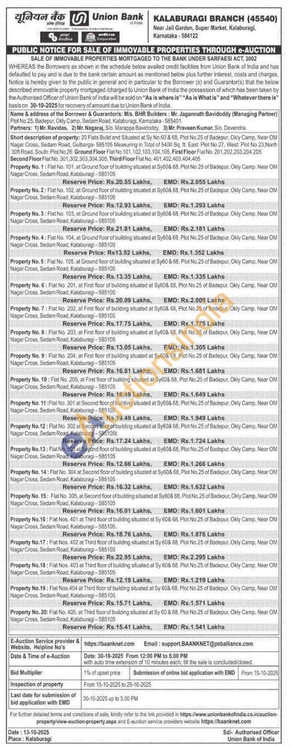 20 Flats Build and Situated at Sy No 60 & 68, Plot No 25 of Badepur, Okly Camp, Near OM Nagar Cross, Sedam Road, Gulbarga-585105 Measuring in Total of 5400 Sq. ft. East Plot No 27, West Plot No 23. North 30ft Road, South: Plot No 26. Ground Floor Flat No 101, 102, 103, 104, 105, First Floor Flat No. 201,202,203,204,205 Second Floor Flat No. 301,302,303,304,305. Third Floor Flat No. 401,402,403,404,405