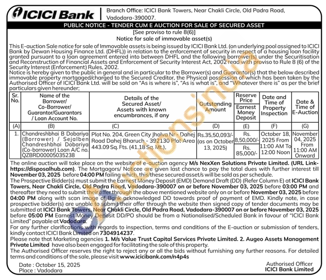 Plot No. 204, Green City Jholva Nr - Dahej Road Dahej Bharuch - 392130 Plot Area 443.09 Sq. Fts. (41.18 Sq. Mt
