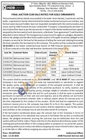 HDB Financial Services Limited Gold Auctions Auction in Jaipur