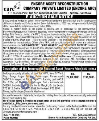 build-up property situated at Unit No. 47/1 New G Ward, Opp. Ganga Nagar Society, Kubernagar, Ahmedabad-382475 (in respect of Raam No. 47/1, forming part fo C.S. No. 2204, of Mouje Sardarnagar, Dist. Ahmedabad-342001, bounded by:- On the North: Margin, On the South CTS 2212. On the East: CTS 2203, On the West: CTS 2205 Owned by Kamiaben Shyamilal Wadhwani