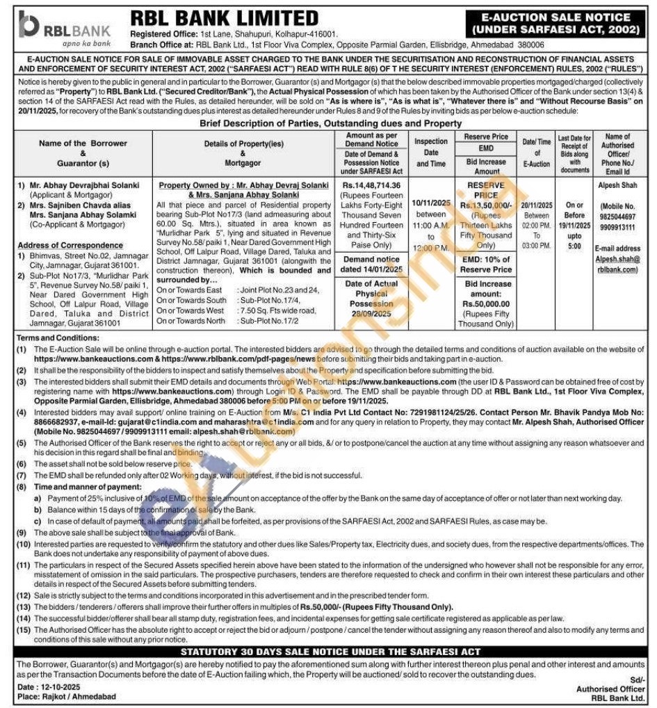 All that piece and parcel of Residential property bearing Sub-Plot No17/3 (land admeasuring about 60.00 Sq. Mtrs.), situated in area known as "Murlidhar Park 5", lying and situated in Revenue Survey No.58/paiki 1, Near Dared Government High School, Off Lalpur Road, Village Dared, Taluka and District Jamnagar, Gujarat 361001 (alongwith the construction thereon), Which is bounded and surrounded by... On or Towards East On or Towards South Onor Towards West On or Towards North Joint Plot No.23 and 24, Sub-Plot No. 17/4, 7.50 Sq. Fts wide road, Sub-Plot No.17/2