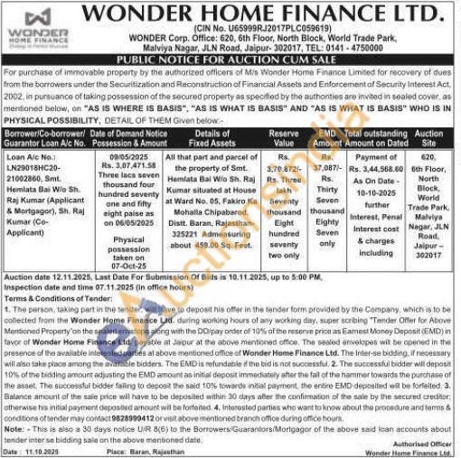 All that part and parcel of the property of Smt. Hemlata Bai Wo Sh. Raj Kumar situated at House at Ward No. 05, Fakiro Ka Mohalla Chipabarod, Distt. Baran, Rajasthan 325221 Admeasuring about 459.00 Sq. Feet