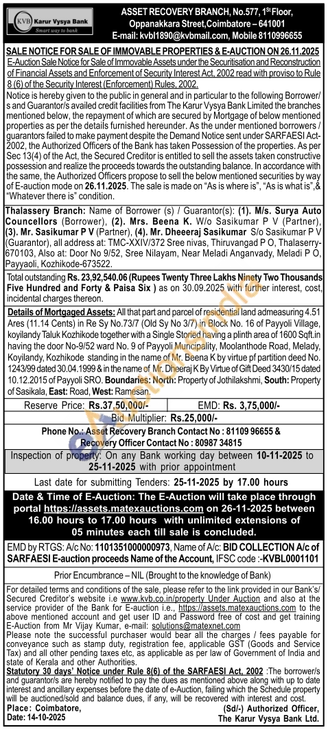 All that part and parcel of residential land admeasuring 4.51 Ares (11.14 Cents) in Re Sy No.73/7 (Old Sy No 3/7) in Block No. 16 of Payyoli Village, koyilandy Taluk Kozhikode together with a Single Storied having a plinth area of 1600 Sqft.in having the door No-9/52 ward No. 9 of Payyoli Muncipality, Moolanthode Road, Melady, Koyilandy, Kozhikode standing in the name of Mr. Beena K by virtue of partition deed No. 1243/99 dated 30.04.1999 & in the name of Mr. Dheeraj K By Virtue of Gift Deed 3430/15 dated 10.12.2015 of Payyoli SRO. Boundaries: North: Property of Jothilakshmi, South: Property of Sasikala, East: Road, West: Ramesan.