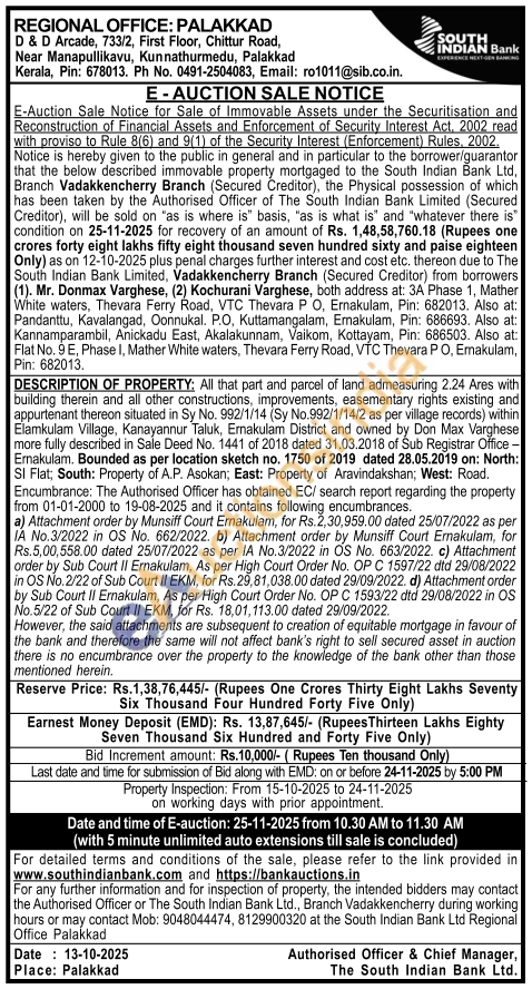 All that part and parcel of land admeasuring 2.24 Ares with building therein and all other constructions, improvements, easementary rights existing and appurtenant thereon situated in Sy No. 992/1/14 (Sy No.992/1/14/2 as per village records) within Elamkulam Village, Kanayannur Taluk, Ernakulam District and owned by Don Max Varghese more fully described in Sale Deed No. 1441 of 2018 dated 31.03.2018 of Sub Registrar Office -Ernakulam. Bounded as per location sketch no. 1750 of 2019 dated 28.05.2019 on: North: SI Flat, South: Property of A.P. Asokan; East: Property of Aravindakshan; West: Road. Encumbrance: The Authorised Officer has obtained EC/ search report regarding the property from 01-01-2000 to 19-08-2025 and it contains following encumbrances. a) Attachment order by Munsiff Court Ernakulam, for Rs.2,30,959.00 dated 25/07/2022 as per IA No.3/2022 in OS No. 662/2022. b) Attachment order by Munsiff Court Ernakulam, for Rs.5,00,558.00 dated 25/07/2022 as per IA No.3/2022 in OS No. 663/2022. c) Attachment order by Sub Court II Ernakulam, As per High Court Order No. OP C 1597/22 dtd 29/08/2022 in OS No. 2/22 of Sub Court II EKM, for Rs. 29,81,038.00 dated 29/09/2022. d) Attachment order by Sub Court II Ernakulam, As per High Court Order No. OP C 1593/22 dtd 29/08/2022 in OS No.5/22 of Sub Court II EKM, for Rs. 18,01,113.00 dated 29/09/2022.