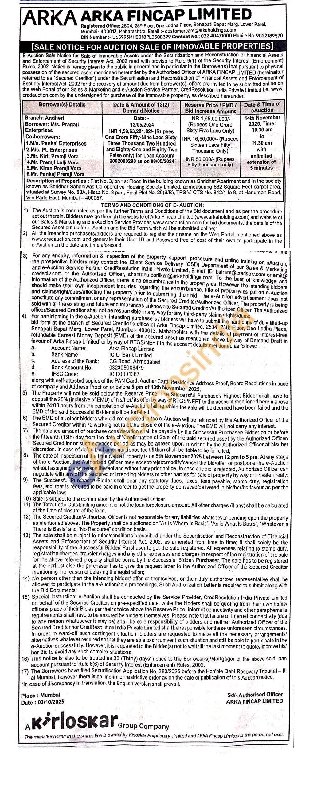Description of Properties: Flat No. 3, on 1st Floor, in the building known as Shridhar Apartment and in the society known as Shridhar Sahaniwas Co-operative Housing Society Limited, admeasuring 632 Square Feet carpet area, situated at Survey No. 88A, Hissa No. 3 part, Final Plot No. 20(6/B), TPS V, CTS No. 842/1 to 8, at Hanuman Road, Vile Parle East, Mumbai-400057.