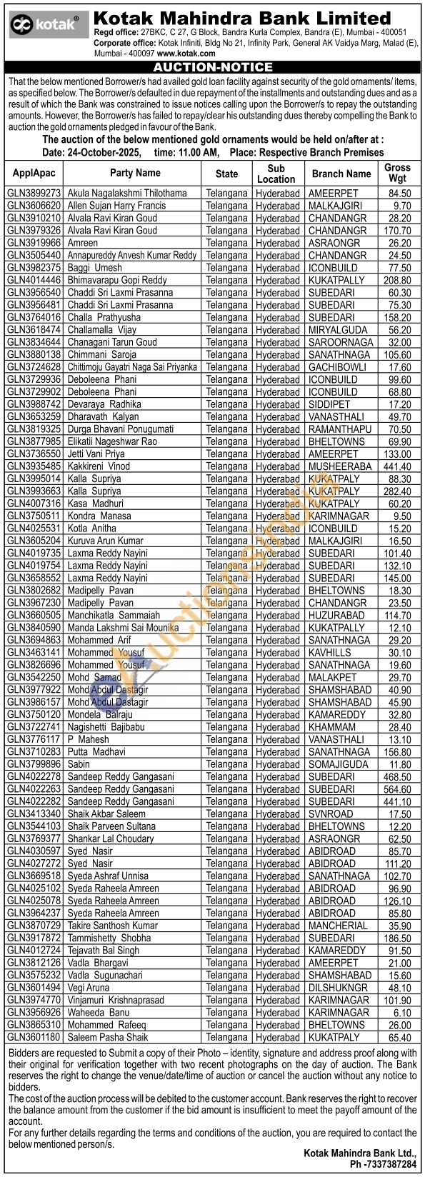 Kotak Mahindra Bank Gold Auctions Auction in Mumbai