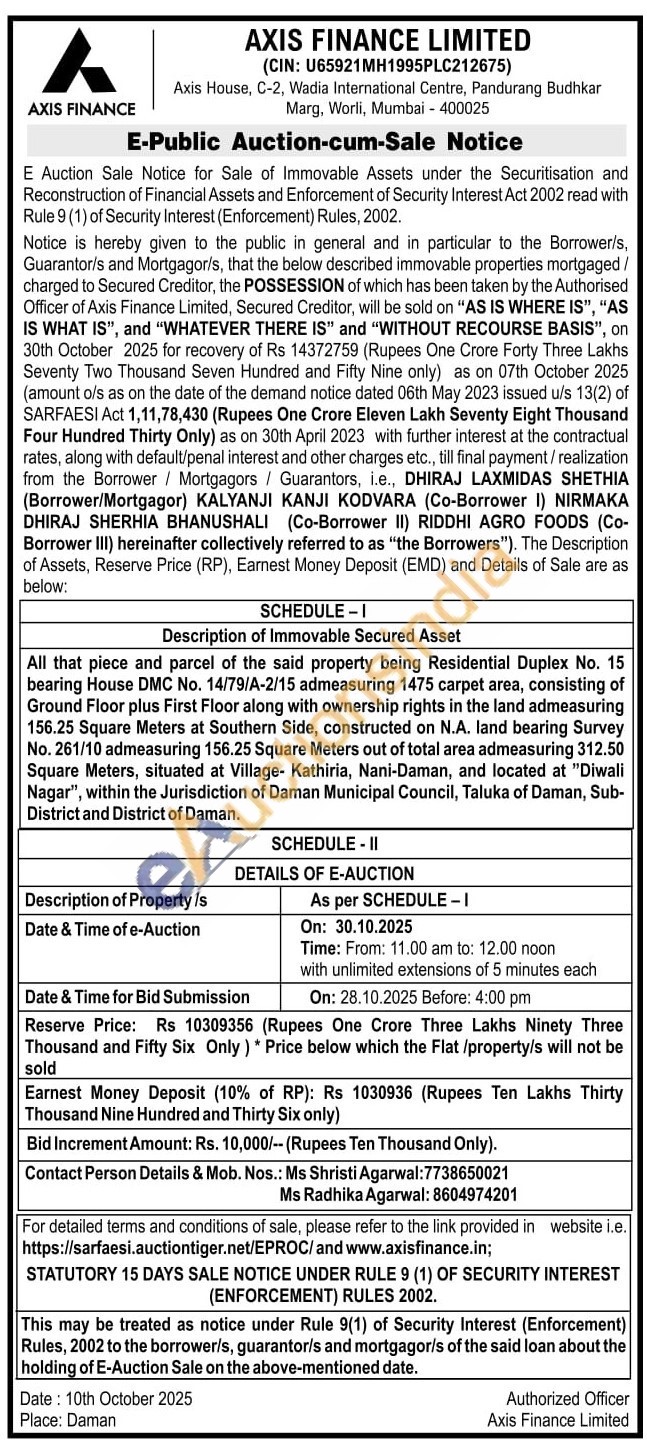 All that piece and parcel of the said property being Residential Duplex No. 15 bearing House DMC No. 14/79/A-2/15 admeasuring 1475 carpet area, consisting of Ground Floor plus First Floor along with ownership rights in the land admeasuring 156.25 Square Meters at Southern Side, constructed on N.A. land bearing Survey No. 261/10 admeasuring 156.25 Square Meters out of total area admeasuring 312.50 Square Meters, situated at Village- Kathiria, Nani-Daman, and located at "Diwali Nagar", within the Jurisdiction of Daman Municipal Council, Taluka of Daman, Sub-District and District of Daman.