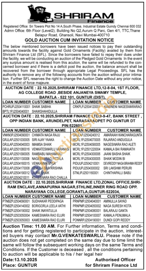 Shriram Finance Ltd Gold Auctions Auction in Chennai