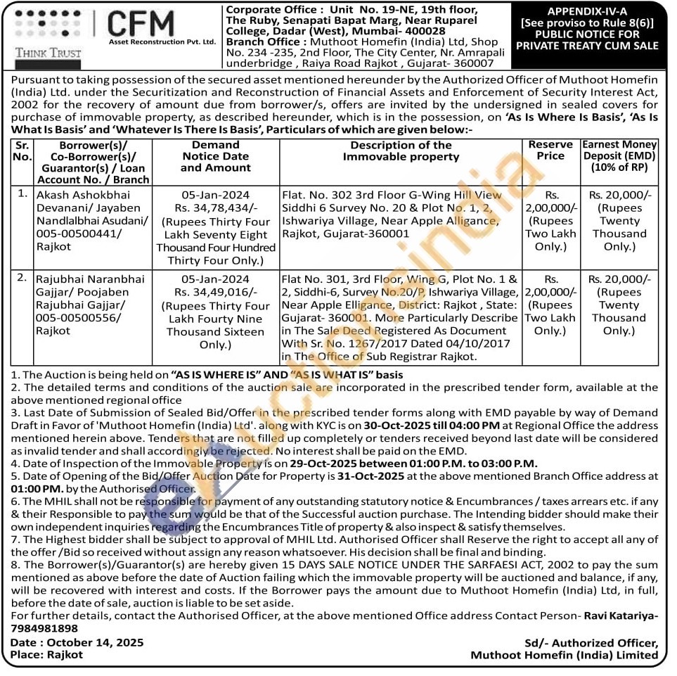 Flat No. 301, 3rd Floor, Wing G, Plot No. 1 & 2, Siddhi-6, Survey No.20/P, Ishwariya Village, Near Apple Elligance, District: Rajkot, State: Gujarat-360001. More Particularly Describe in The Sale Deed Registered As Document With Sr. No. 1267/2017 Dated 04/10/2017 in The Office of Sub Registrar Rajkot.